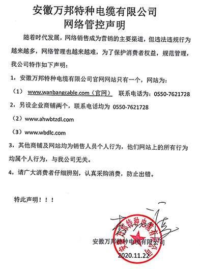 鄭重聲明:安徽萬邦特種電纜有限公司官方網站為:www_wanbangcable_com.boloumi.com,除此之外無任何子網站或合作網站,其余均為假冒偽劣。電話:0550-7621728 13485756353 地 址:安徽省天長市滁州高新技術產業開發區經四路29號